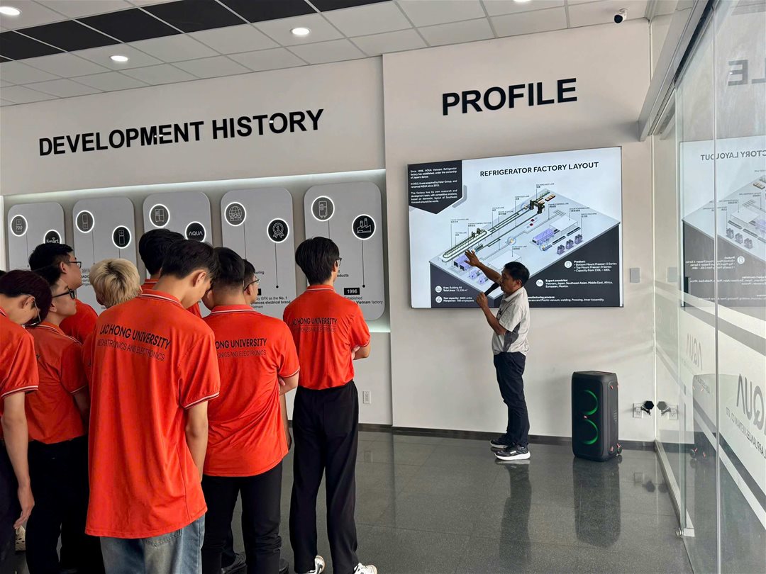 Tại buổi tham quan, sinh viên được đại diện công ty giới thiệu tổng quan về lịch sử hình thành và phát triển của thương hiệu AQUA, một trong những doanh nghiệp điện tử hàng đầu Việt Nam, thuộc tập đoàn Haier Group . Với hơn 25 năm hoạt động tại Việt Nam, AQUA đã không ngừng mở rộng quy mô sản xuất, khẳng định vị thế thương hiệu thông qua các sản phẩm gia dụng chất lượng cao như tủ lạnh, máy giặt, máy điều hòa và nhiều dòng sản phẩm điện tử tiên tiến khác, đáp ứng tiêu chuẩn quốc tế.