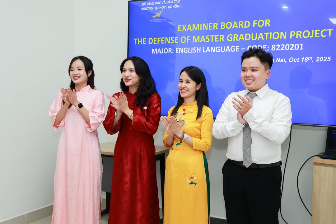 Ngày 18 tháng 10 năm 2025, tại Phòng Tiến sĩ (B107) của Trường Đại học Lạc Hồng, 04 học viên ngành Ngôn ngữ Anh đã bảo vệ và hoàn thành xuất sắc đồ án tốt nghiệp thạc sĩ của mình. Buổi bảo vệ diễn ra dưới sự đánh giá của Hội đồng chuyên môn, bao gồm các chuyên gia trong lĩnh vực Ngôn ngữ Anh, những người đã đưa ra các nhận định sâu sắc và mang tính học thuật cao.