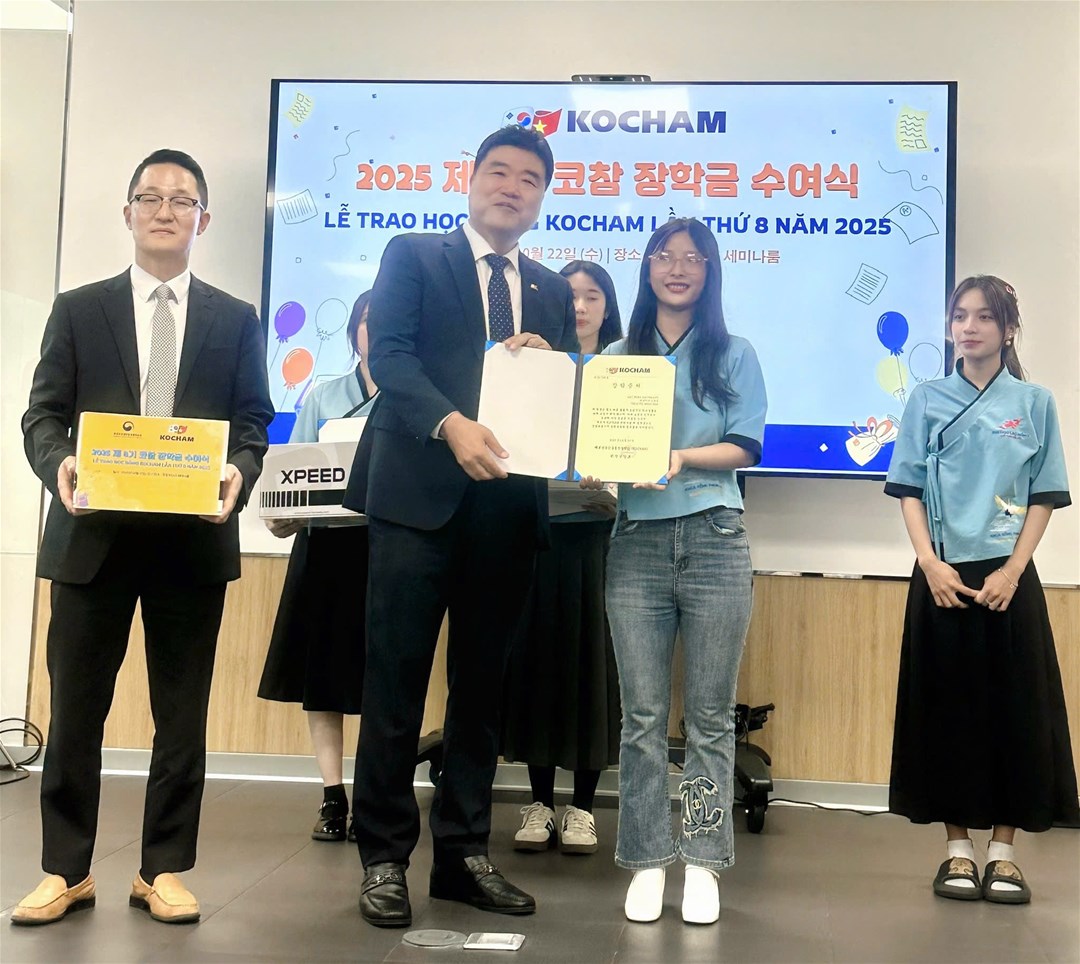 Vào chiều ngày 22/10/2025, Hiệp hội Thương mại và Công nghiệp Hàn Quốc (KOCHAM) đã trao tặng 04 suất học bổng cho sinh viên Ngành Hàn Quốc học – Trường Đại học Lạc Hồng, mỗi suất trị giá 5.000.000 đồng.
