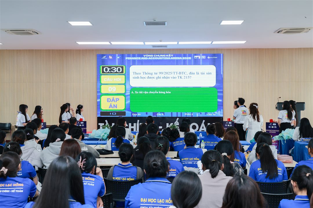 On the afternoon of December 4, 2025, at Hall A301, Lac Hong University, the Faculty of Finance and Accounting successfully hosted the Final Round of the “Finance & Accounting Arena 2025” (FA Arena 2025). The event marked the conclusion of an exciting, intellectually rich, and highly competitive season, showcasing the academic strengths of students in the economic disciplines—particularly Accounting and Finance–Banking.