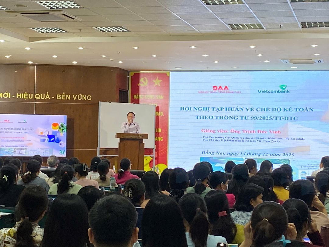 In order to promptly update new regulations on corporate accounting regimes and enhance training quality in line with practical requirements, lecturers of the Faculty of Finance and Accounting, Lac Hong University, participated in a training conference on the implementation of Circular No. 99/2025/TT-BTC organized by the Dong Nai Accounting Association. The program was held on December 14, 2025, at the Vietcombank Dong Nai Conference Hall.