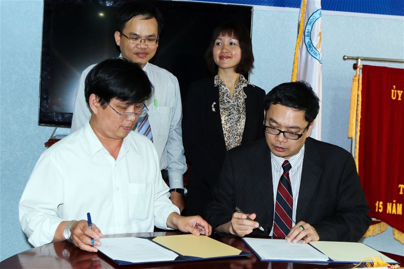 LHU's Vice Rector Lam Thanh Hien (white shirt) implemented the signature of cooperation with CSU's Vice President Cheng Shuenn Ren