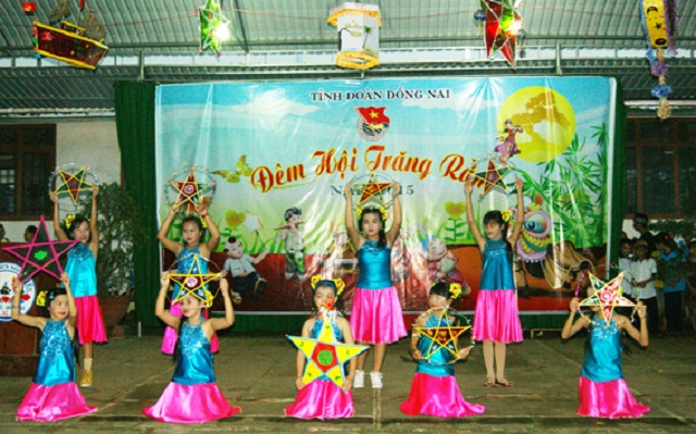 The same day, LHU delegation attended "Full moon 2015" for children with difficult circumstances, held at Ngo Quyen Secondary School, Song Ray commune in Cam My district. At the program, the participants enjoyed special performances, Chu Cuoi - Chi Hang lively scenes, lion dances, lantern parade,... Here, more than 600 children were presented moon cakes, lanterns, candies,...