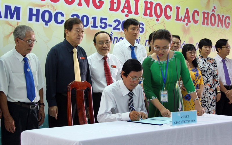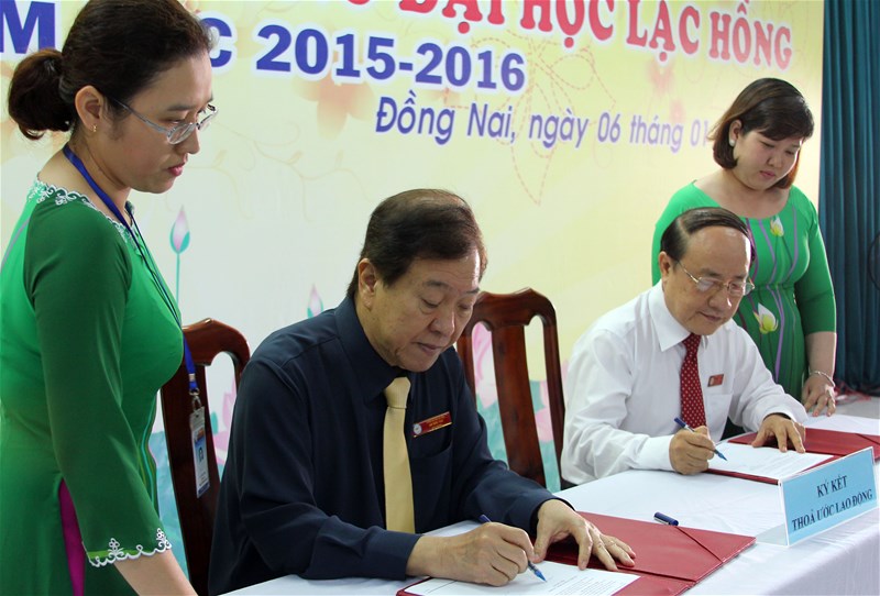 The birth of Collective Agreement signed between the Rector and the Executive Board of Trade Union is the proof of protecting the legal and legitimate rights of laborers in the University. After a half of a month of colleting laborers' opinions, at the conference, Mr. Do Huu Tai - Chairman of the Board of Trustees - Rector and Mr. Diep Cam Thu - Chairman of Trade Union signed the Collective Labor Agreement of the academic year 2015 - 2016. In addition, in order to speed up emulation movements, representatives of 26 units of the University signed the Emulation Agreement of 2015 -2016 school year.