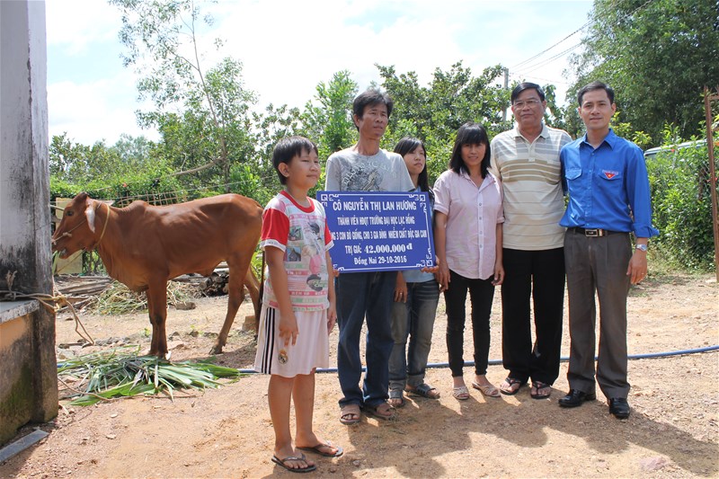 Recently, LHU Member of the Trustees Board Nguyen Thi Lan Huong presented three breeding cows totaling VND 42 million to three dioxin-affected families with difficult circumstances in Cam My and Dinh Quan districts.