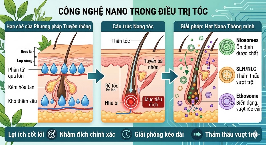 • Ưu điểm vượt trội: Các hệ thống vận chuyển nano giúp tăng độ hòa tan, ổn định hoạt chất, giải phóng có kiểm soát và cho phép nhắm mục tiêu chính xác vào nang tóc.