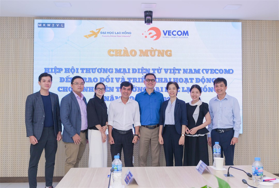 On November 10, 2025, the Vietnam E-commerce Association (VECOM) held a working session with the Faculty of Information Technology – Lac Hong University to discuss and orient cooperation, and to implement support activities for E-commerce students in the near future.