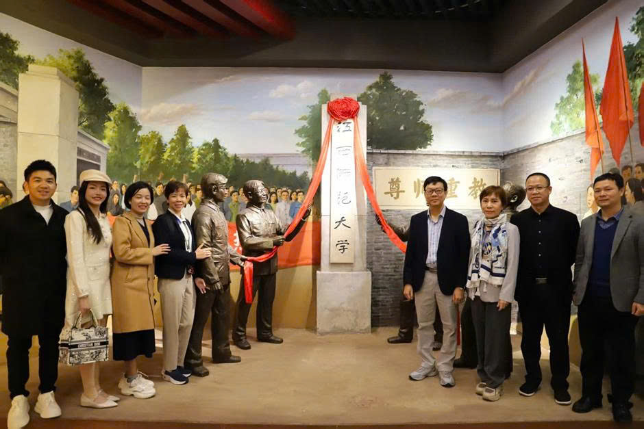 Members of the Lac Hong University delegation pose for a commemorative photograph in front of the official emblem of Jiangxi Normal University