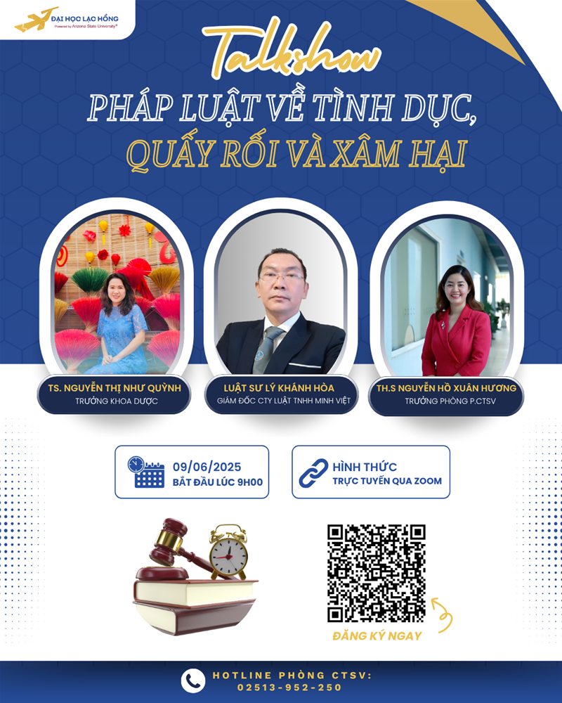 In today’s society, understanding the laws related to sexuality, harassment, and abuse is not only essential for self-protection but also vital in building a safe and civilized community. To raise awareness and spread knowledge to both students and the wider society, the Student Affairs Office in collaboration with the Faculty of Pharmacy – Lac Hong University is organizing the Talkshow “Laws on Sexuality, Harassment, and Abuse.”